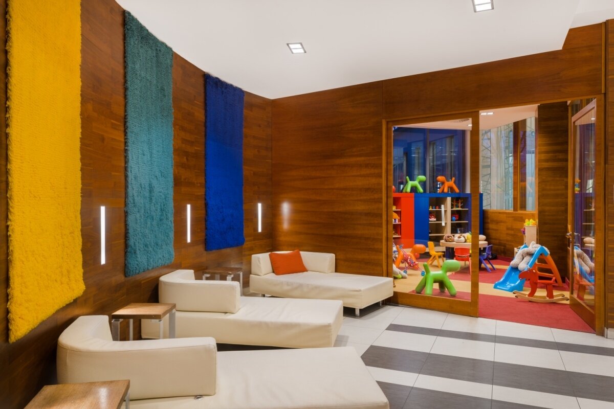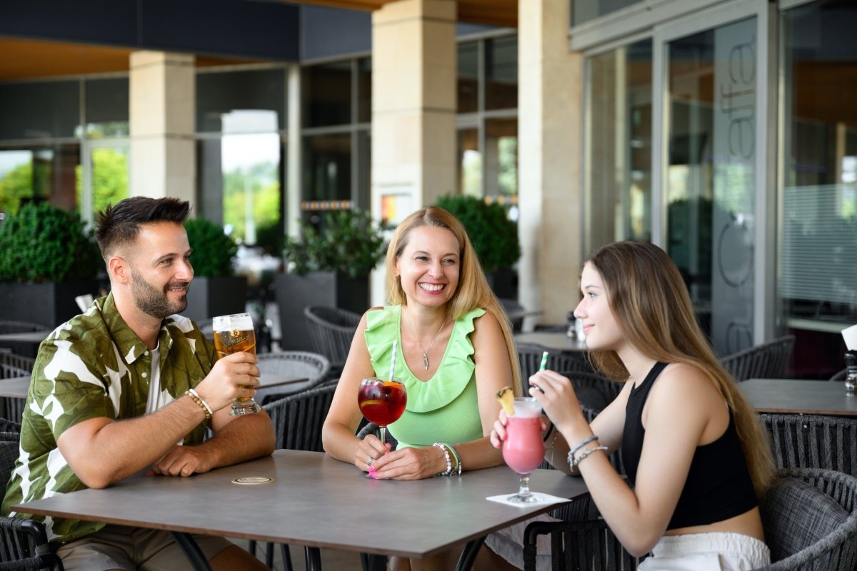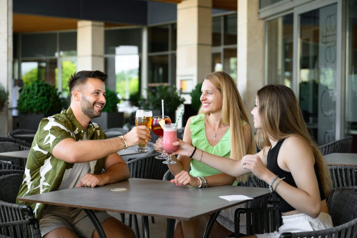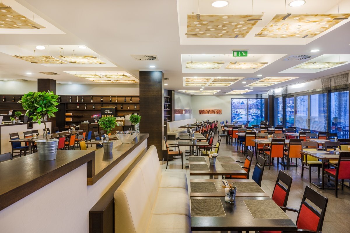 Restaurace a bar La Caraffa s venkovní terasou nabízí stravování formou bufetu. Graffiti bar, dětský koutek, kulečník, stolní fotbal a šipky. Recepce, vlastní parkoviště a podzemní garáže za poplatek – platí se na místě. Nabíjecí stanice pro elektrokola a elektro koloběžky zdarma. Nabíjecí stanice pro elektromobily se nachází v podzemní garáži.