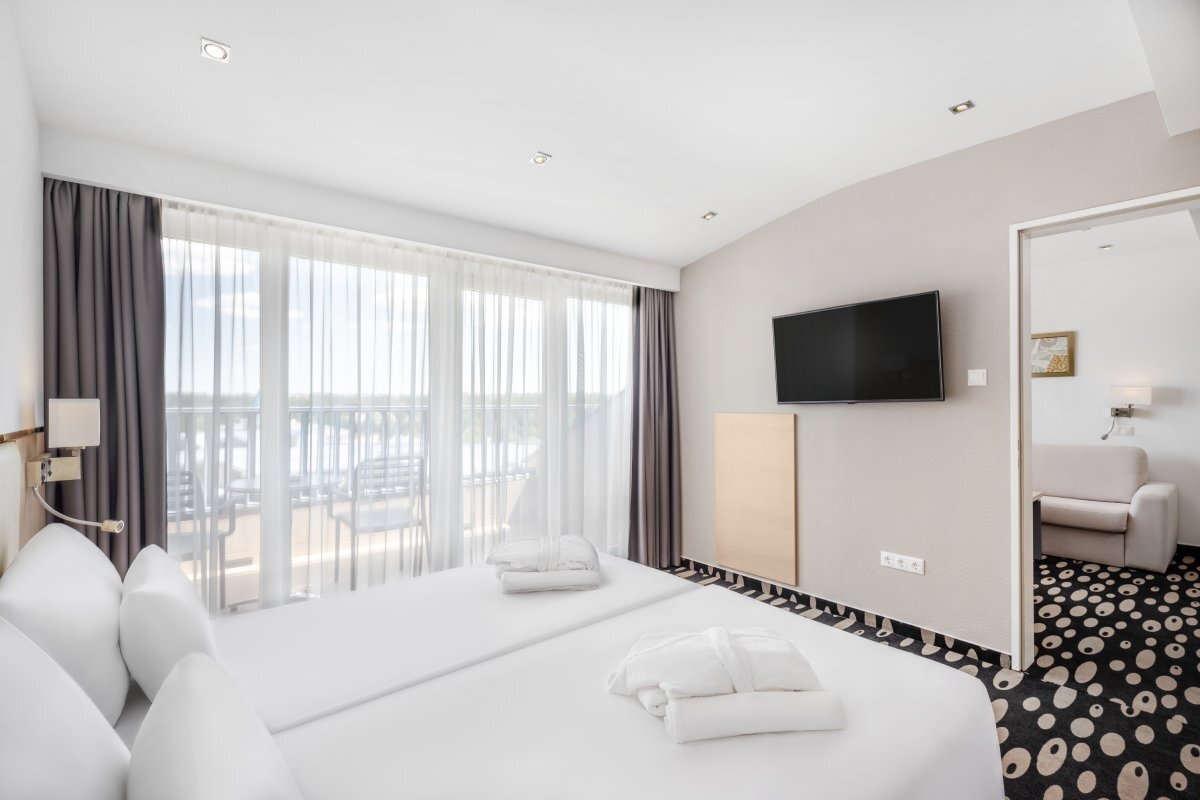 Hotel je propojen s termálními lázněmi krytou chodbou. Hotel nabízí pokoje STANDARD s možností 1 přistýlky a 1 postýlky, rodinné pokoje * = 2 pokoje STANDARD propojené dveřmi nebo apartmán s 1 ložnicí a obývacím pokojem se 2 přistýlkami. V případě objednání „rodinného pokoje“ hotel poskytne budˇ 2 pokoje STANDARD propojené dveřmi nebo apartmán s 1 ložnicí a obývacím pokojem s možností 2 přistýlek. Hotel předem nemůže závazně potvrdit, kterou z těchto 2 variant ubytování poskytne. Vybavení pokojů: individuálně nastavitelná klimatizace, koupelna se sprchovým koutem, WC, fén, župan, TV-SAT (ČT24), telefon, rádio, Wi-Fi zdarma, trezor, mini-bar, rychlovarná konvice + rozpustná káva, čaj, některé pokoje s balkonem (CK nezaručuje pokoj s balkonem).