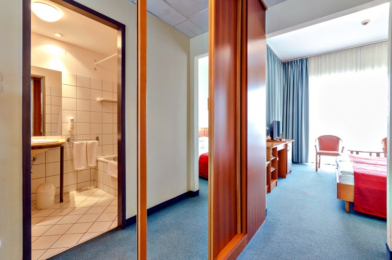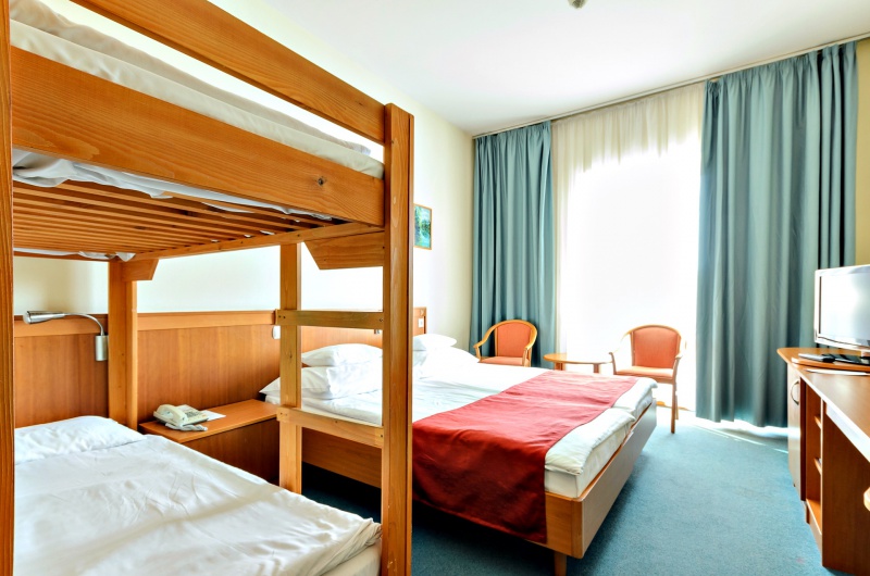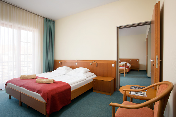 Klimatizované prosklené přemostění na prvním patře hotelu spojuje hotel s termálními lázněmi a letním koupalištěm s mořskou pláží. Hotel nabízí 2 lůžk. pokoje STANDARD: klimatizace, koupelna s vanou, WC, fén, župan, LCD TV, trezor, Wi-Fi, mini-bar, balkon, možnost 1 přistýlky, možnost propojení pokojů. 2 lůžk. pokoje SUPERIOR: klimatizace, koupelna s vanou, WC, fén, župan, LCD TV, trezor, Wi-Fi, mini-bar, bez balkonu, rozkládací pohovka (vhodná pro 1 dospělou osobu nebo 2 děti). Pokoje SUITE: klimatizace, ložnice, obývací pokoj s možností až 3 přistýlek, koupelna s vanou, WC, fén, župan, LCD TV, trezor, Wi-Fi, mini-bar, 2 balkony.