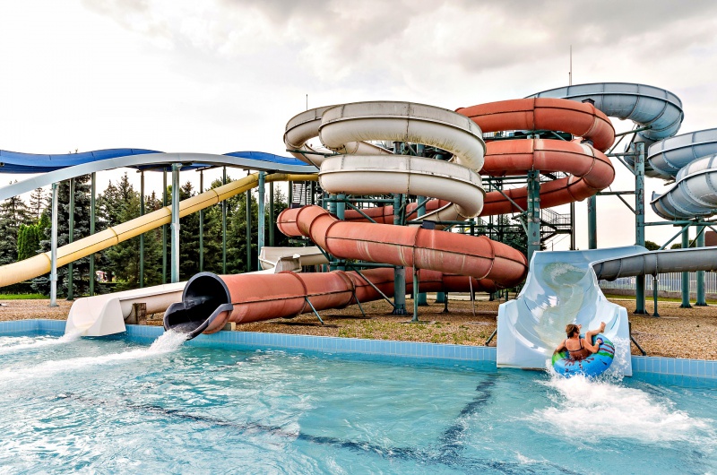 Centrum skluzavek se nalézá v zadní části koupaliště na ploše 1 ha. Zde si na své přijdou jak malí, tak velcí návštěvníci. Aquapark nabízí velké množství vodních atrakcí včetně velkých skluzavek (čtyřtraťová obrovská kamikadze, mohutná skluzavka, „černá díra“, „šílená řeka“, Niagara, big hole, twister, z 12 metrů vysoké věže můžete sjíždět z devíti možných skluzavek). Děti pobaví maličké vodopády, v bazénu stojící sloni (jako živí), dětská skluzavka a dřevěné hřiště. Kdo se unaví klouzáním, může si odpočinout v proudící řece nebo 3 nových bazénech (pro dospělé, děti a nejmenší). V bazénu pro nejmenší pak stojí vodní hrad.