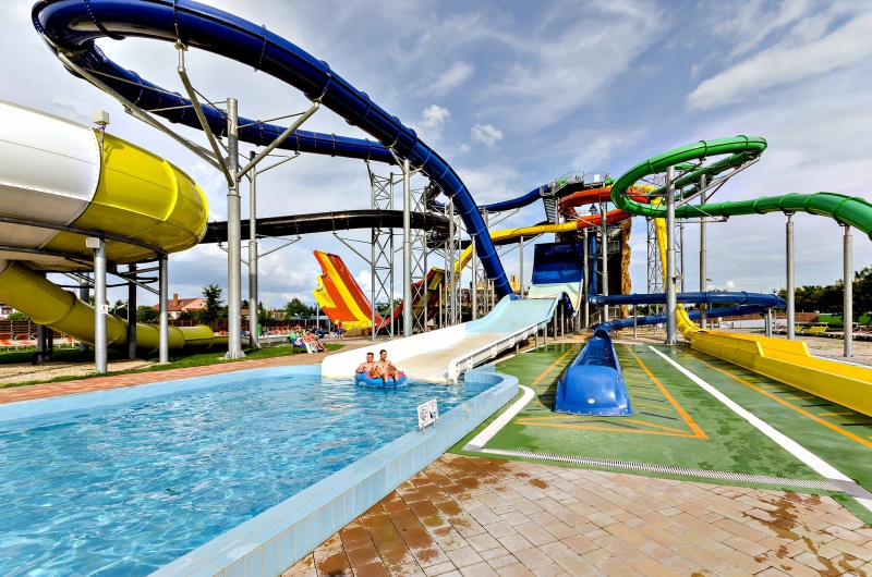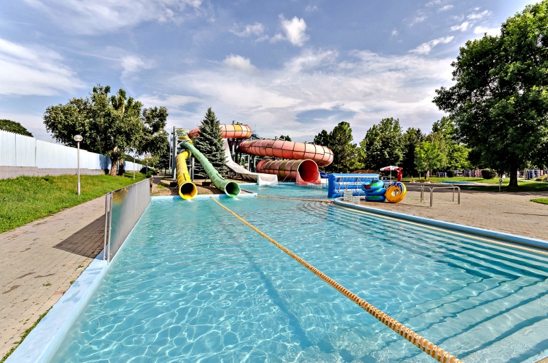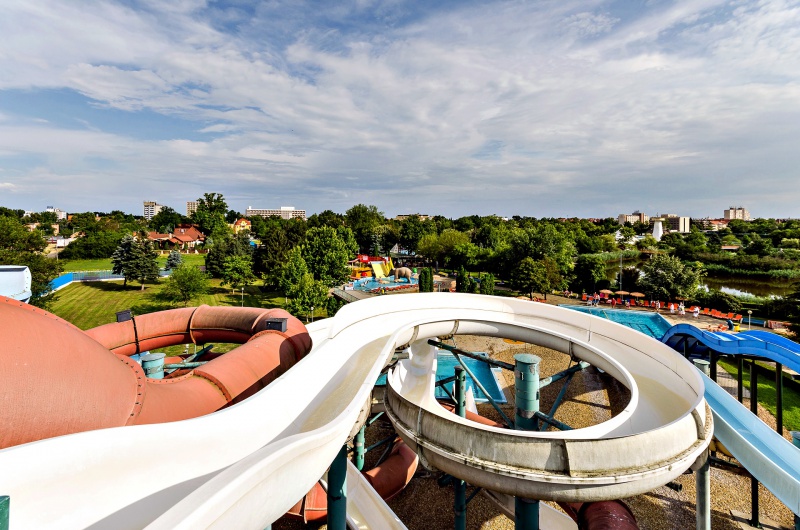 Aquapark: centrum skluzavek se nalézá v zadní části koupaliště na ploše 1 ha. Zde si na své přijdou jak malí, tak velcí návštěvníci. Aquapark nabízí velké množství vodních atrakcí včetně velkých skluzavek (čtyřtraťová obrovská kamikadze, mohutná skluzavka, „černá díra“, „šílená řeka“, Niagara, big hole, twister, z 12 metrů vysoké věže můžete sjíždět z devíti možných skluzavek). Děti pobaví maličké vodopády, v bazénu stojící sloni (jako živí), dětská skluzavka a dřevěné hřiště. Kdo se unaví klouzáním, může si odpočinout v proudící řece nebo 3 nových bazénech (pro dospělé, děti a nejmenší). V bazénu pro nejmenší pak stojí vodní hrad.