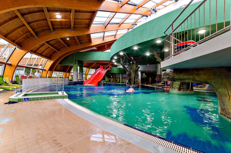 Aqua-Palace s vodní plochou 1 600 m² je zážitkem nejenom pro rodiny s dětmi, ale také pro ty, kteří si přejí zvláštní, tématické lázně a jedinečné wellness zážitky. Exkluzivní dobrodružné bazény evokují různá období a různá místa (tropický bazén, bazén v ledové jeskyni, bazén s kinem, termální bazén Pávai, bazén v jeskyni, římský bazén, bazén Ganga, mořský bazén). Koupání v bazénech je obohaceno různými prvky: vodní masáže, masáže, prameny, proudy, bublinkové lázně, vířivky atd. Rodinné a obří skluzavky jsou připravené pro ty, kdo milují aktivní dobrodružství ve vodě.