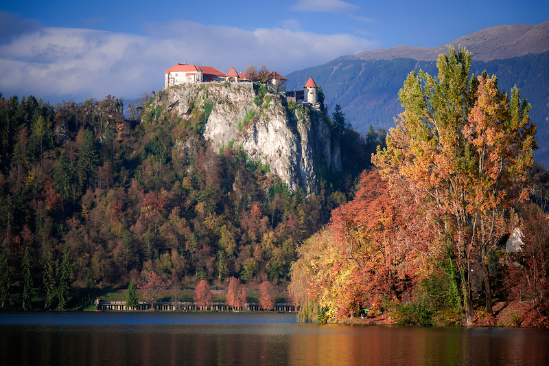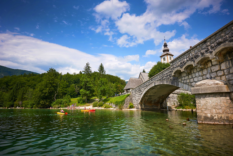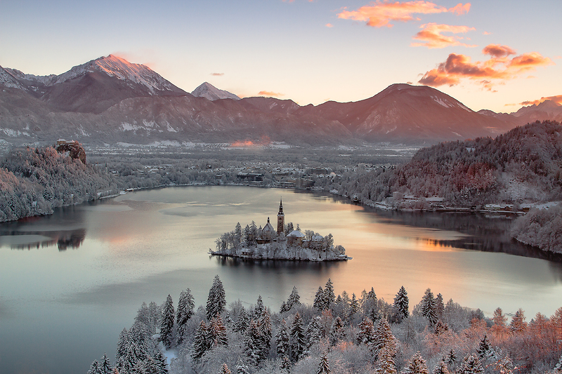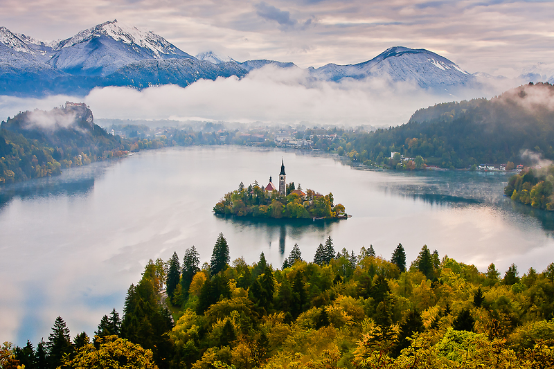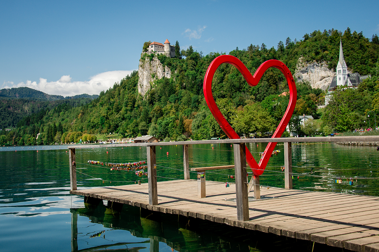 Uprostřed zelené krajiny v popředí majestátních pohoří Julských Alp a Karavanek leží tmavě modré jezero, v jehož středu je malý ostrůvek a na něm jeden z nejfotografovanějších kostelů Slovinska.