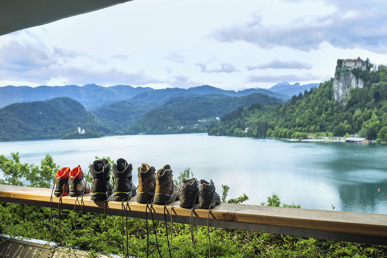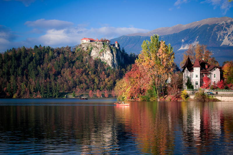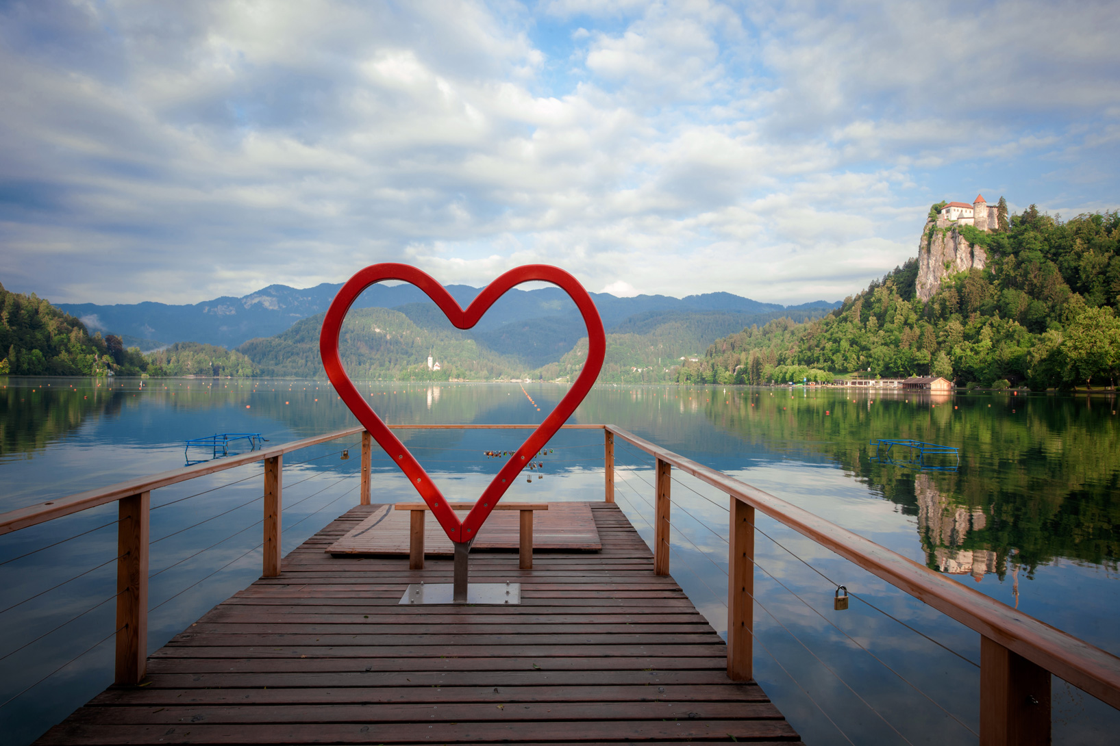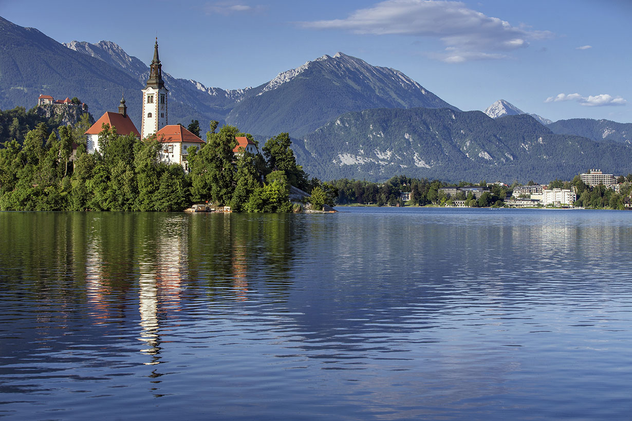 Uprostřed zelené krajiny v popředí majestátních pohoří Julských Alp a Karavanek leží tmavě modré jezero, v jehož středu je malý ostrůvek a na něm jeden z nejfotografovanějších kostelů Slovinska.