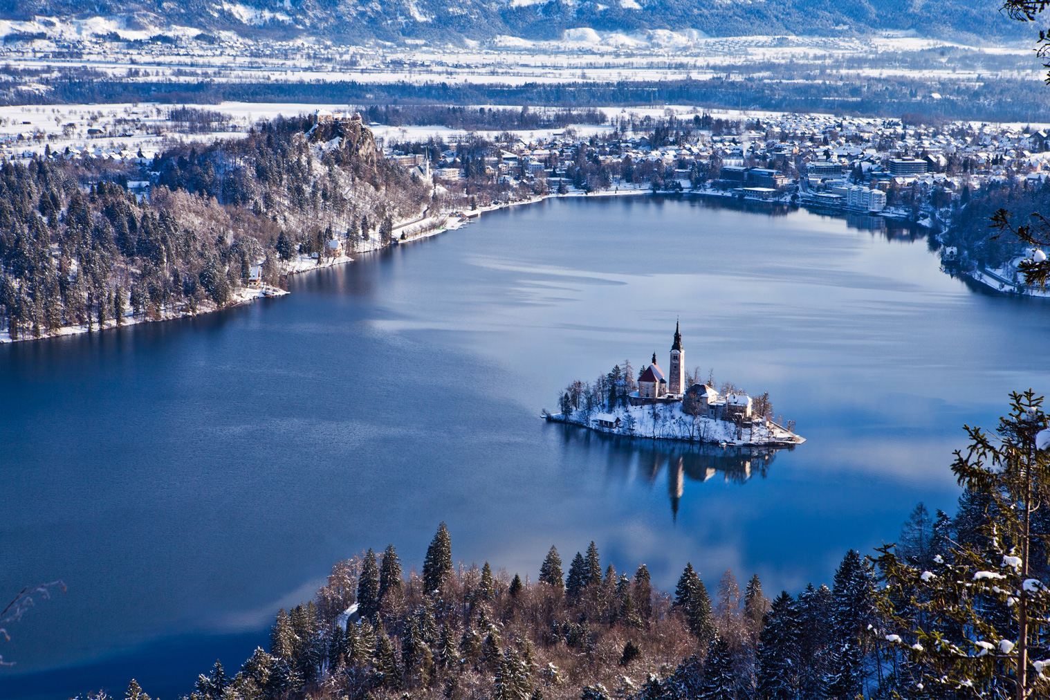 Uprostřed zelené krajiny v popředí majestátních pohoří Julských Alp a Karavanek leží tmavě modré jezero, v jehož středu je malý ostrůvek a na něm jeden z nejfotografovanějších kostelů Slovinska.