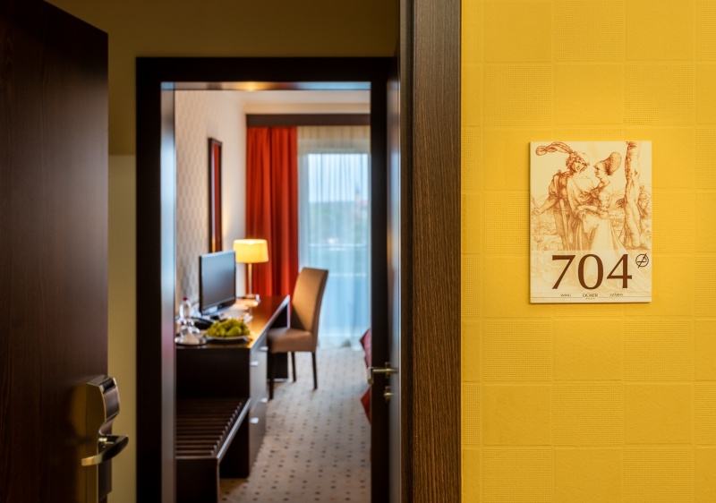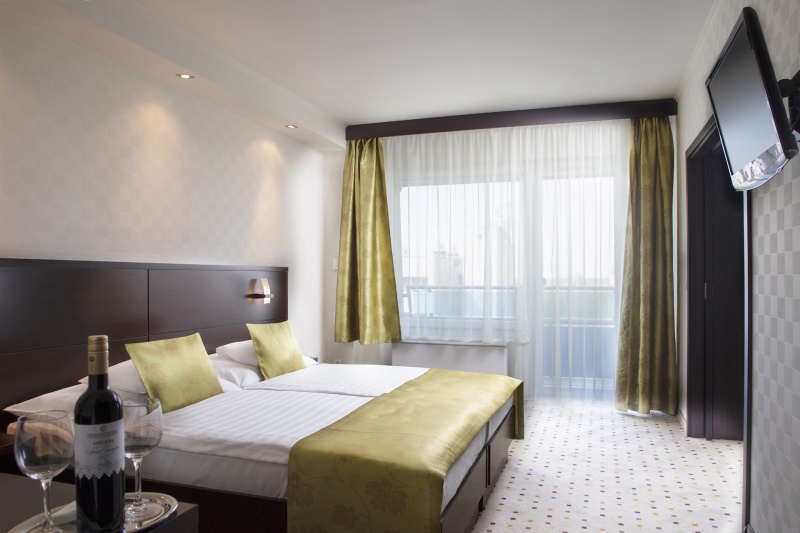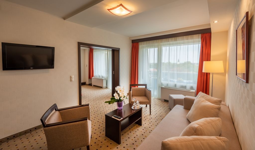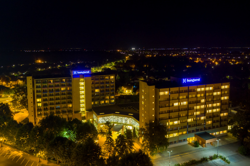 Hotel je propojen s termálními lázněmi VÁRFÜRDŐ a AQUA PALOTA s přímým vstupem z hotelu. Hotel nabízí 1 a 2 lůžkové pokoje s možností přistýlky, vybavené klimatizací, sprchou, županem, WC, LCD-TV, trezorem, telefonem, mini-barem, možností připojení k internetu, některé pokoje s balkonem.