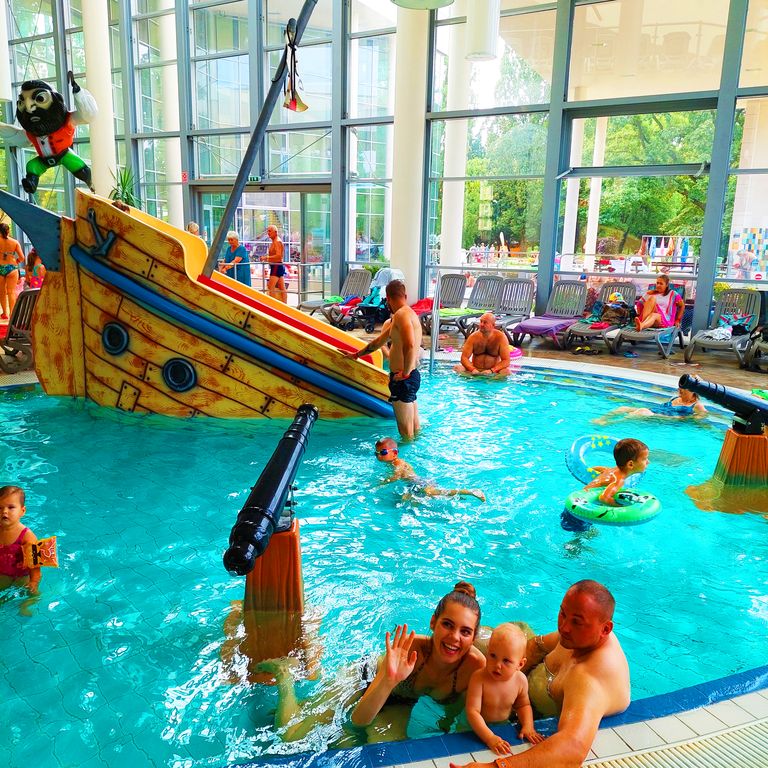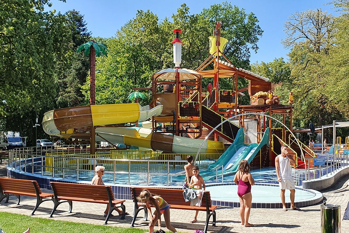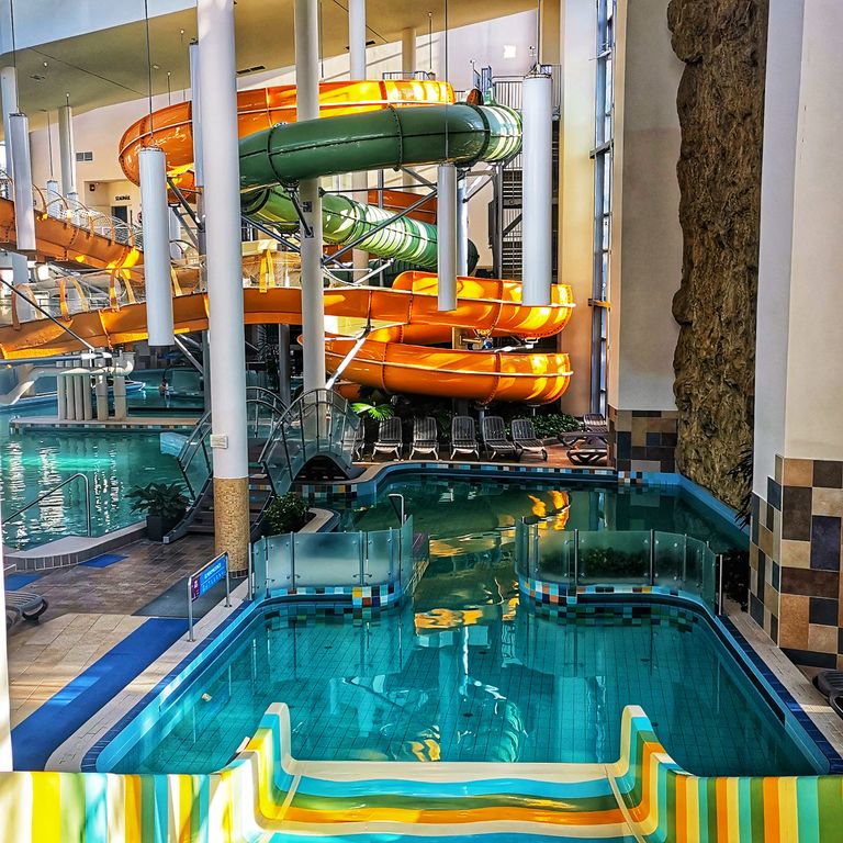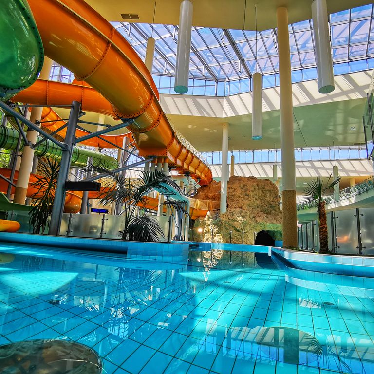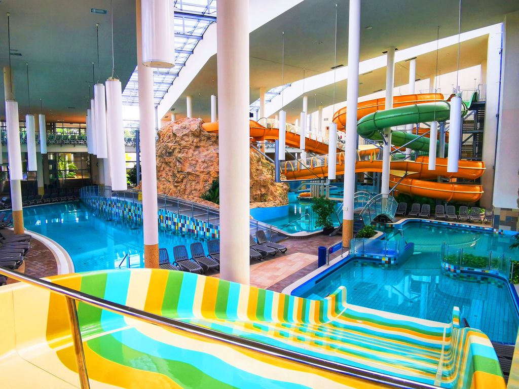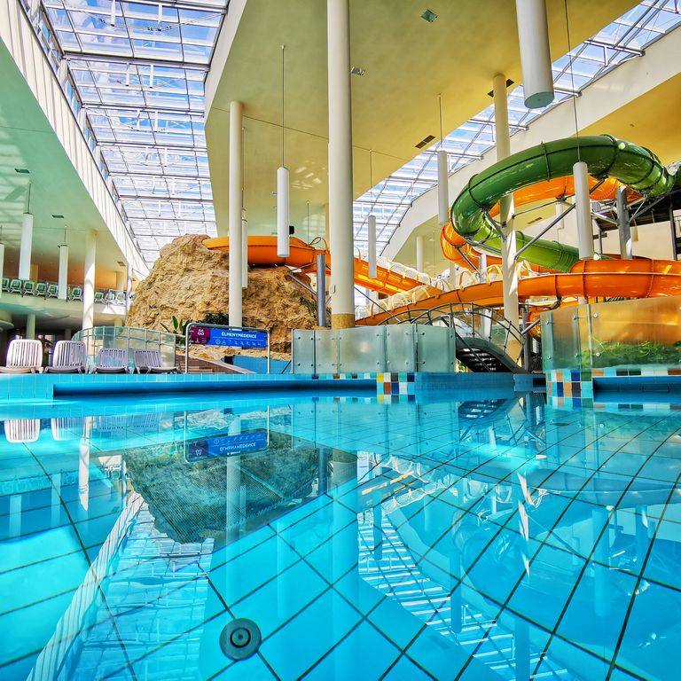 6x termální bazén venkovní, 9x termální bazén krytý, 1x plavecký bazén venkovní, 4x dětský bazén, 1x tobogán