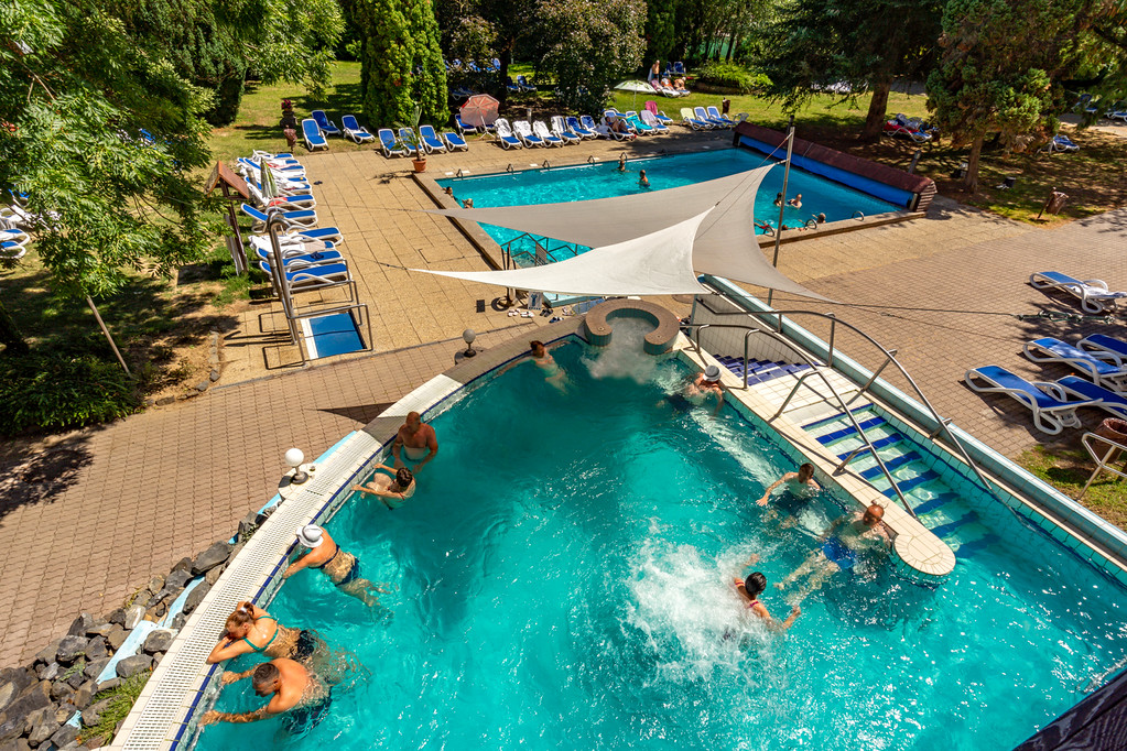 1x krytý léčebný bazén 37 ºC, 1x částečně krytý léčebný bazén 34 – 36 ºC, 1x částečně krytý zážitkový bazén 32 – 34 ºC, vnitřní zážitkový bazén s léčivou vodou 34 – 36 ⁰C.
