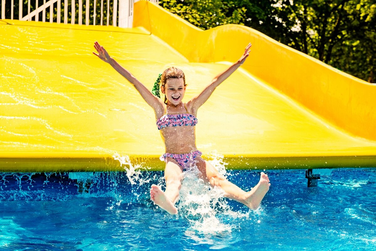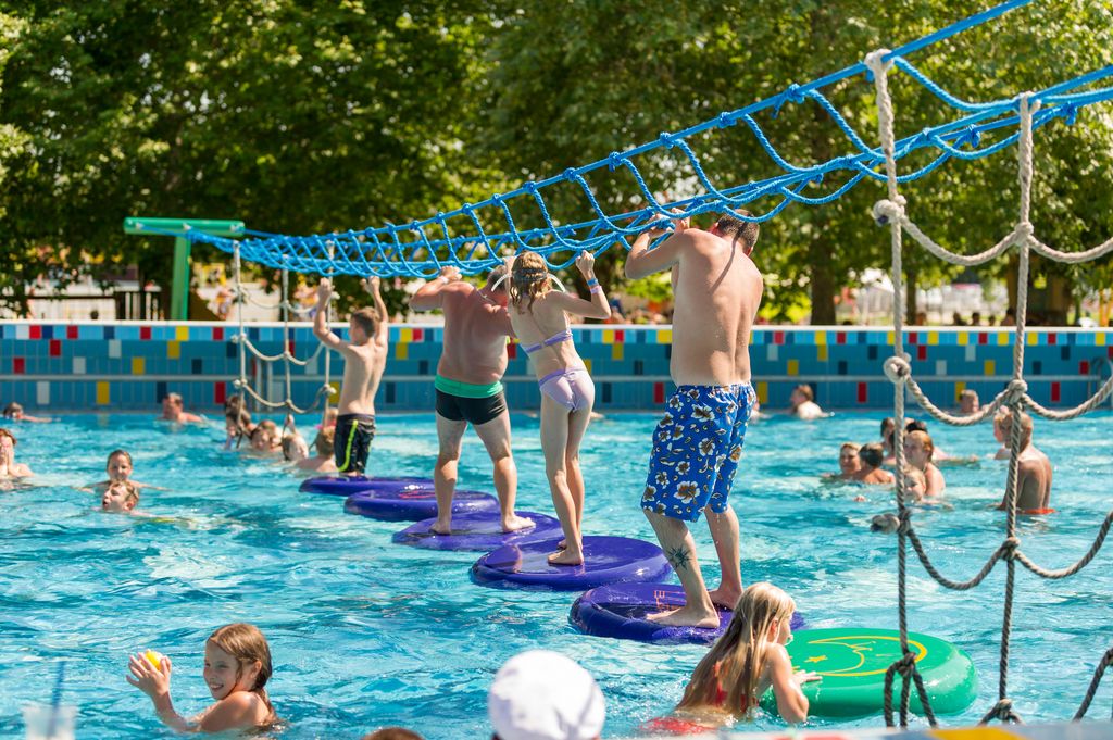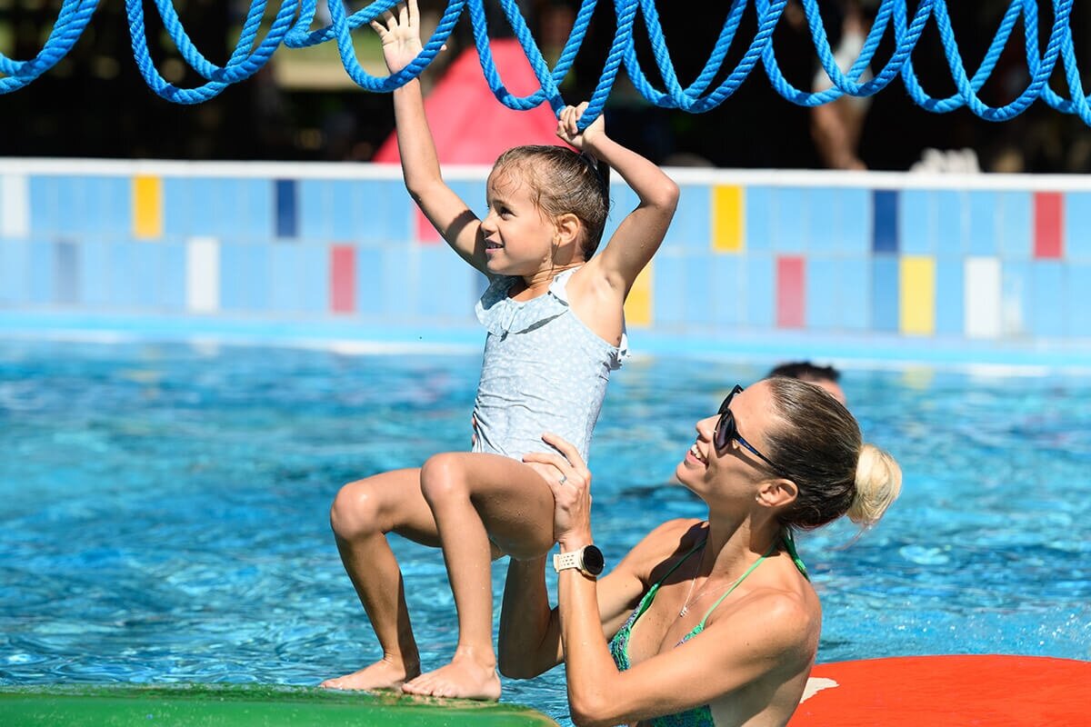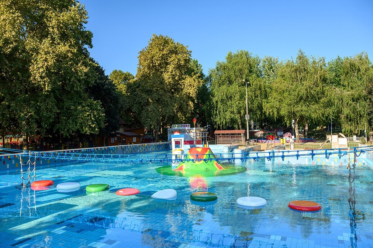 11 Venkovní rodinný bazén se širokou skluzavkou, skluzavkou pro nejmenší, lanový most s vodními ostrůvky (vodní plocha 559 m², teplota 32 °C, hloubka 1,2 m).