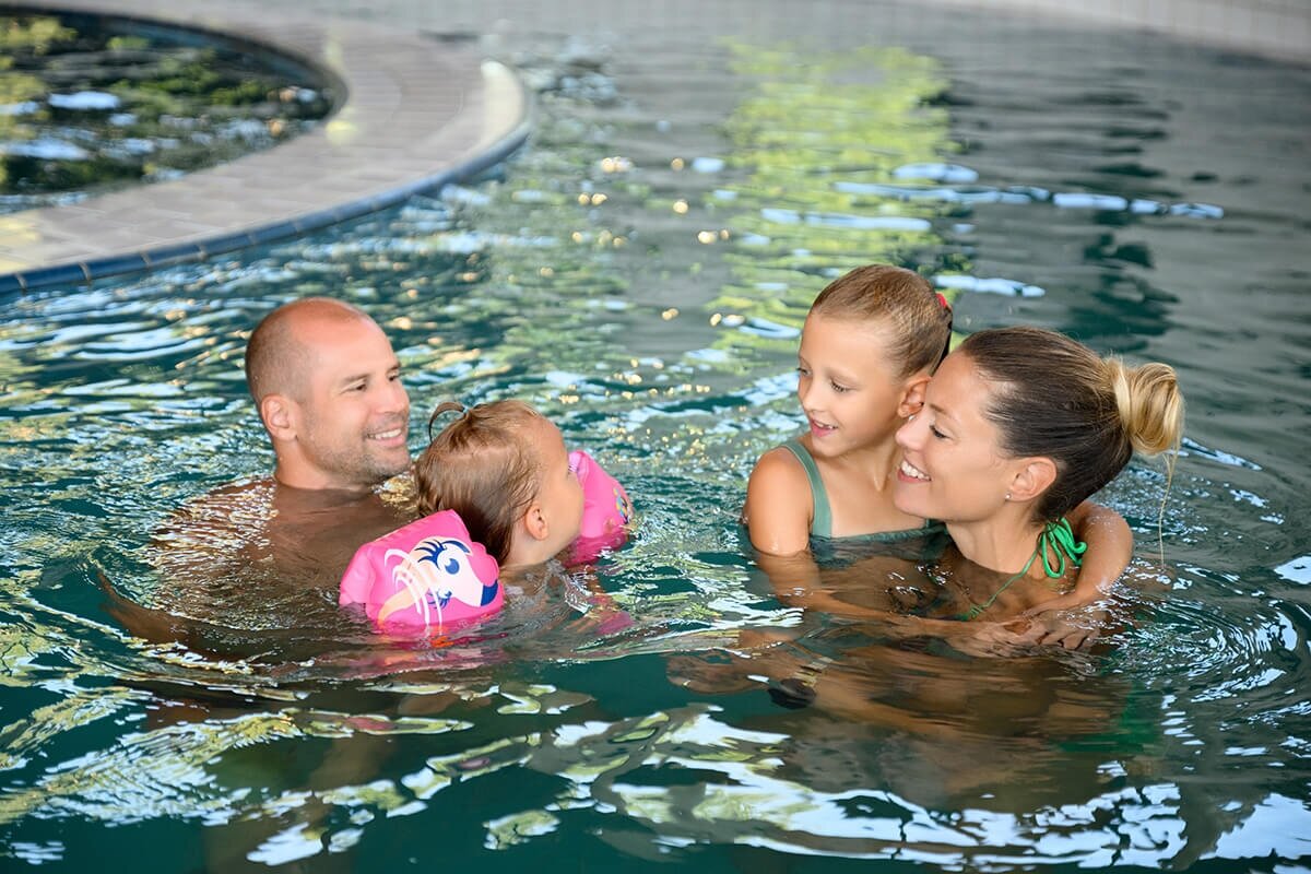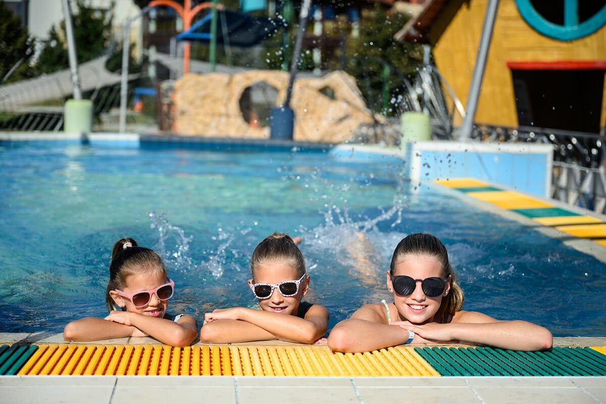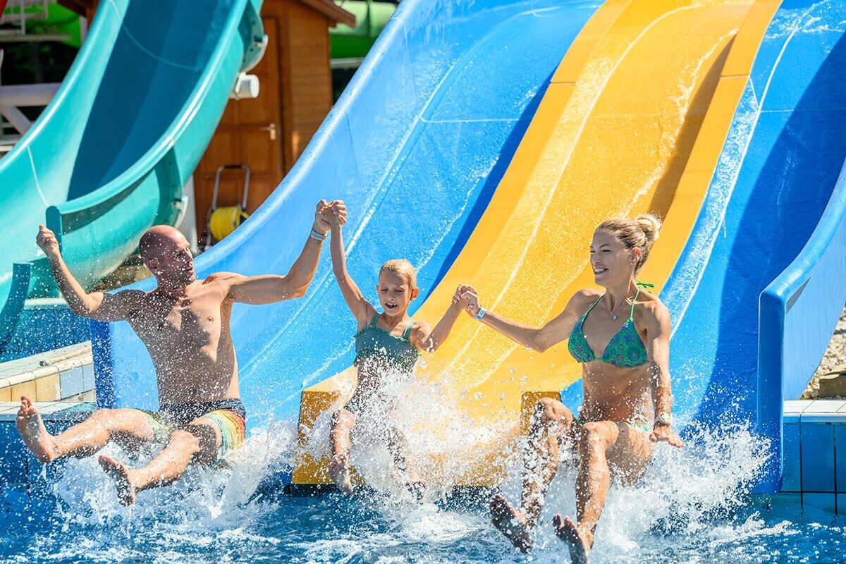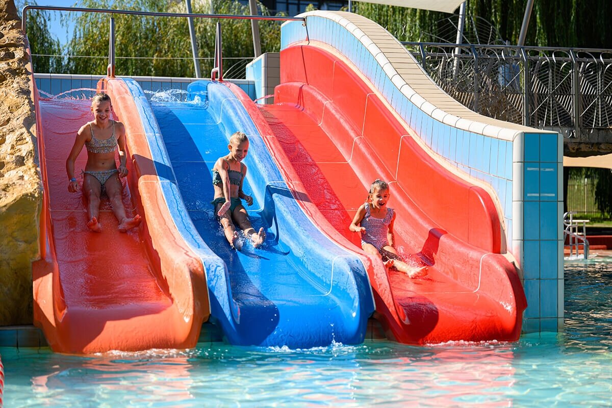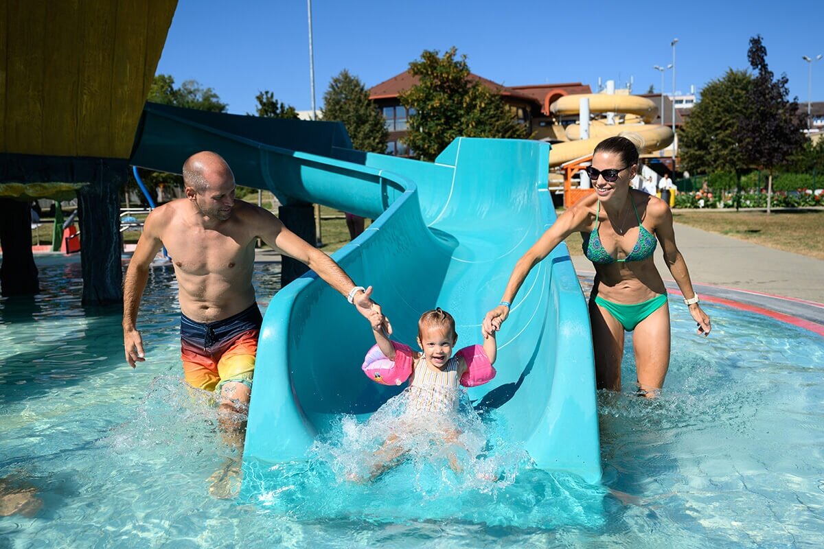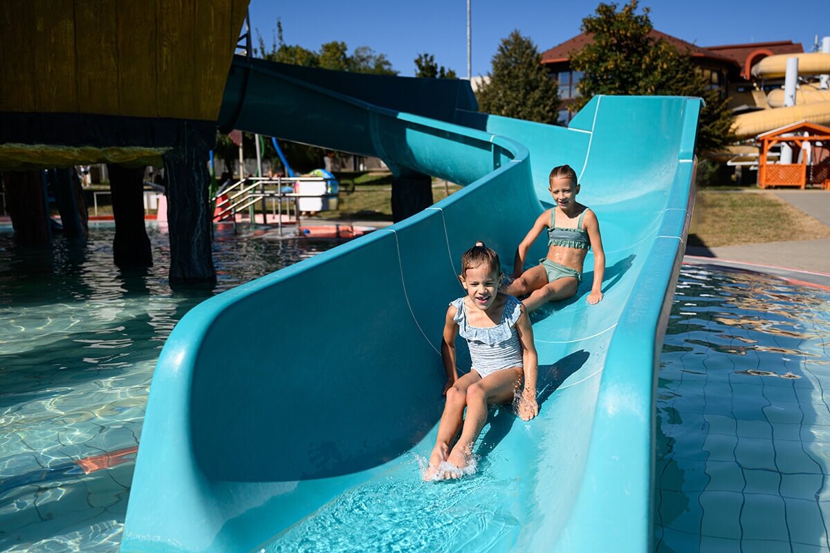 Vnitřní a venkovní zážitkové bazény nejen pro děti nabízejí velké množství vodních atrakcí (masážní lehátka, bublinkové koupele, vodní hřib, krční vodní masáž, rychle tekoucí řeka, skluzavky).
