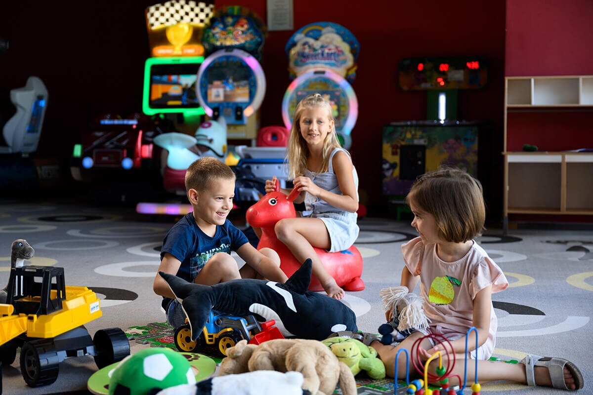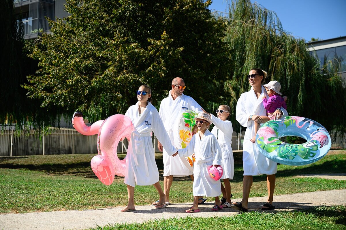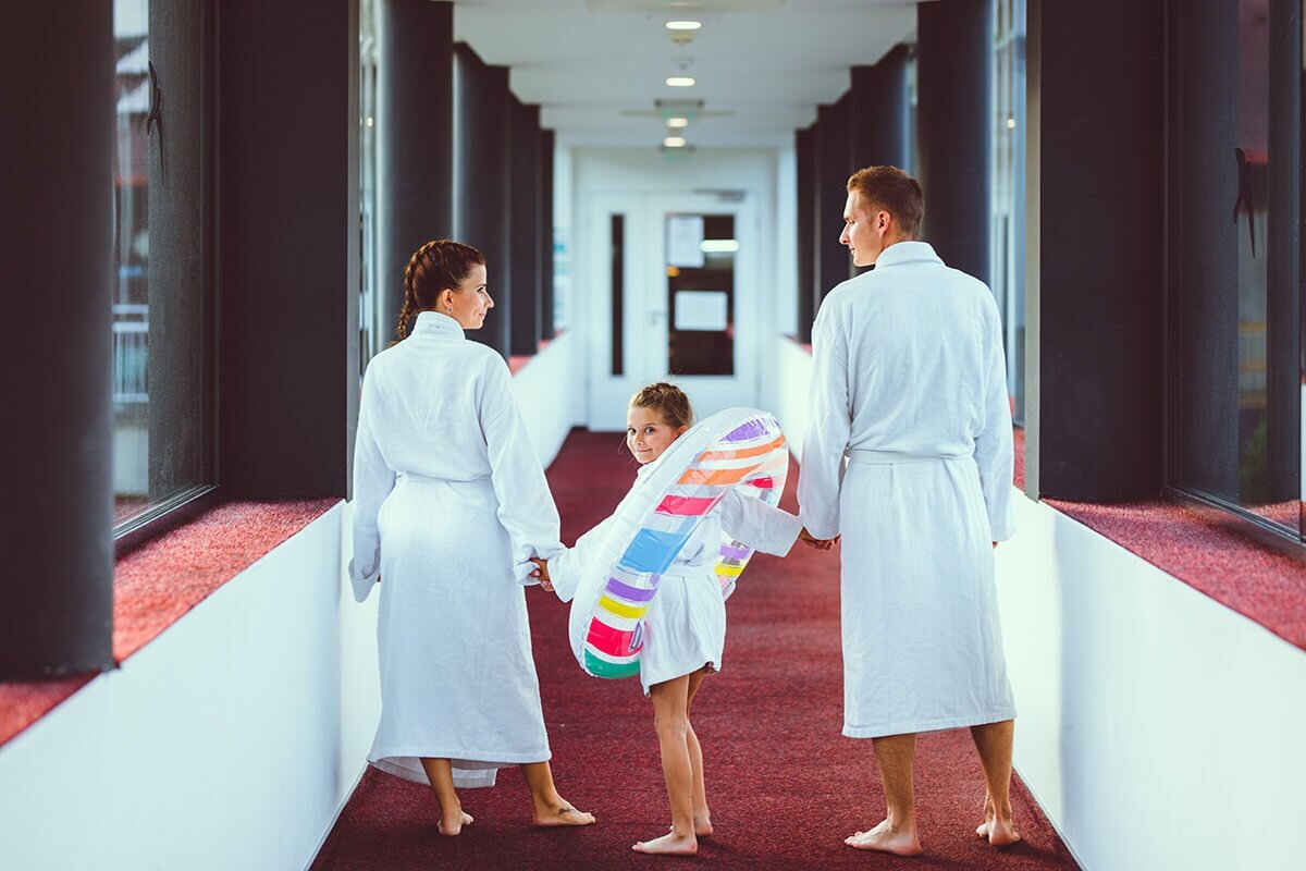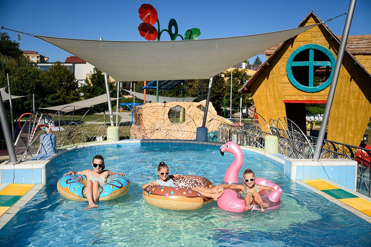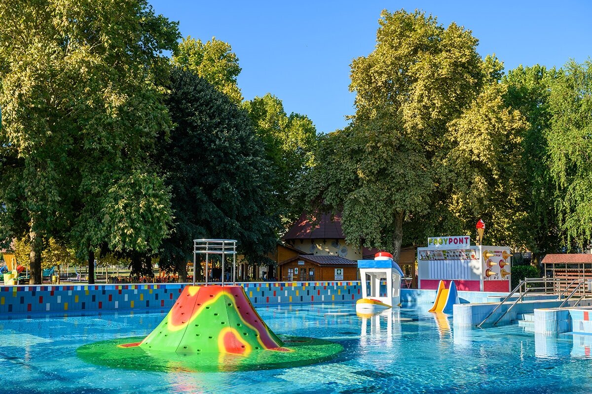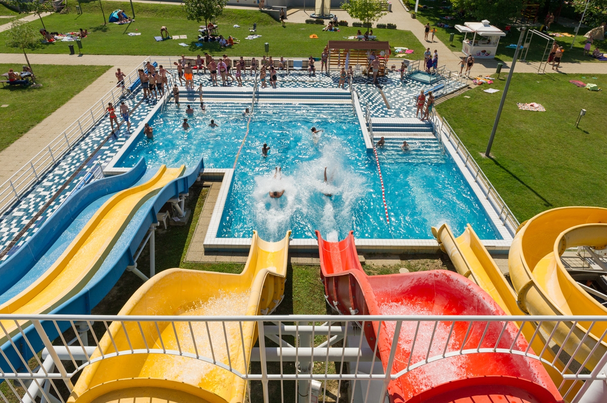 Vnitřní a venkovní zážitkové bazény nejen pro děti nabízejí velké množství vodních atrakcí (masážní lehátka, bublinkové koupele, vodní hřib, krční vodní masáž, rychle tekoucí řeka, skluzavky).