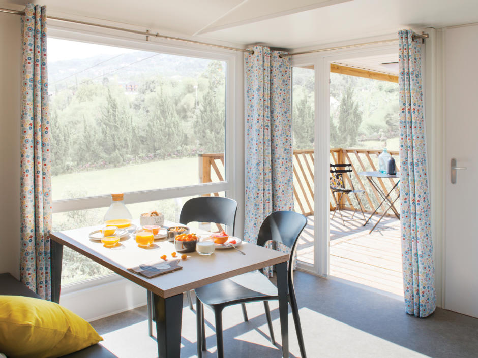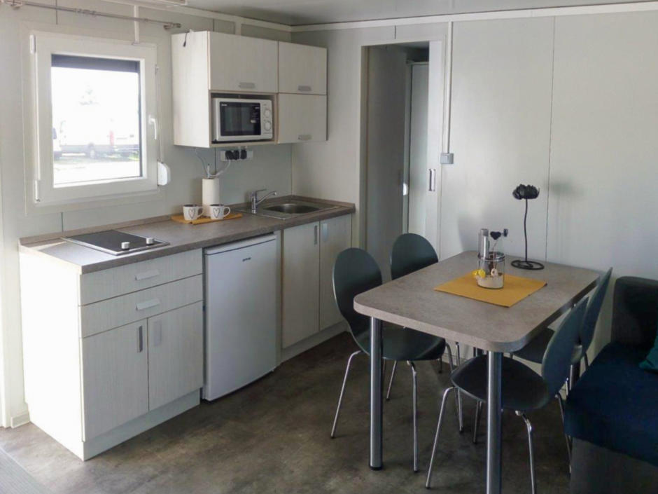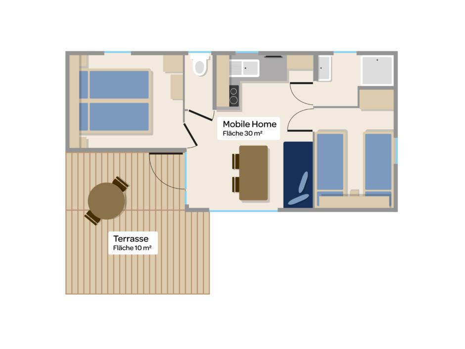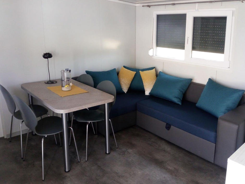 V kempu se nachází 24 nových moderních mobilních domů (cca 30 m²), které jsou vybaveny vším, co potřebujete pro Vaši dovolenou: dvě útulné ložnice, otevřený obývací prostor s rozkládací pohovkou, vybavená kuchyň (lednice, sporák, mikrovlnná trouba, varná konvice, nádobí), koupelna se sprchou a WC, ručníky, ložní prádlo, klimatizace, vytápění, trezor, Wi-Fi, terasa (cca 10 m²).