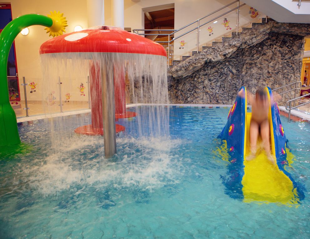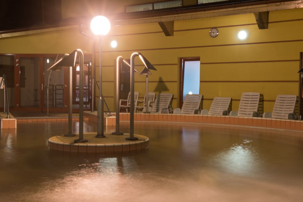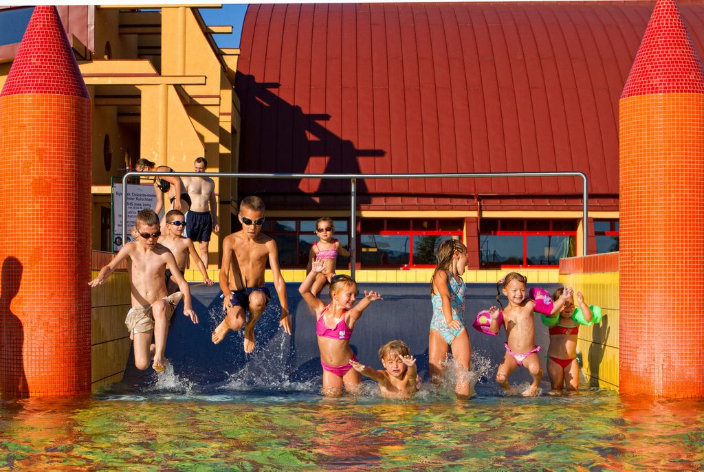 Hosté využívají termální lázně o vodní ploše 1600 m² (krytý 25 m dlouhý plavecký bazén 24-26 °C, krytý výukový bazén 29-30 °C, ochlazovací bazén u sauny 10-12 °C, termální léčivý bazén 33-35 °C, kombinovaný krytý a otevřený sedací bazén s léčivou vodou 32-34 °C, venkovní dětský bazén se skluzavkou 30-32 °C – letní provoz, dětský bazén na hraní 28-30 ºC – letní provoz, zážitkový bazén s rozlohou 560 m² – letní provoz).