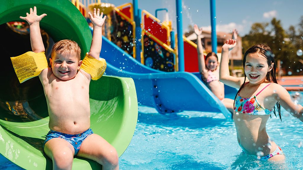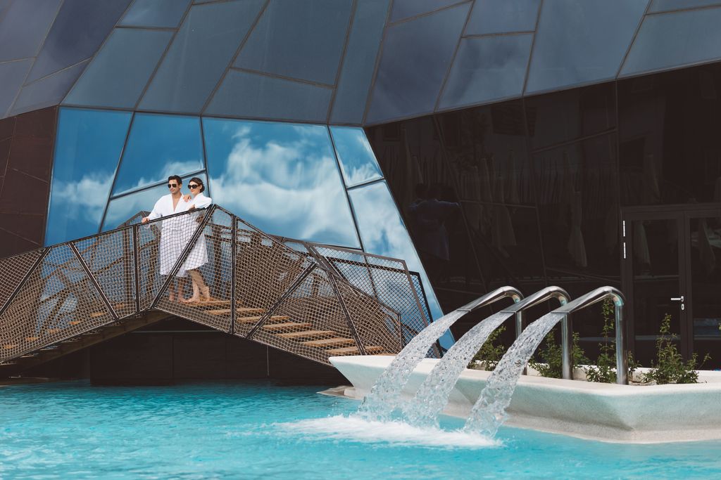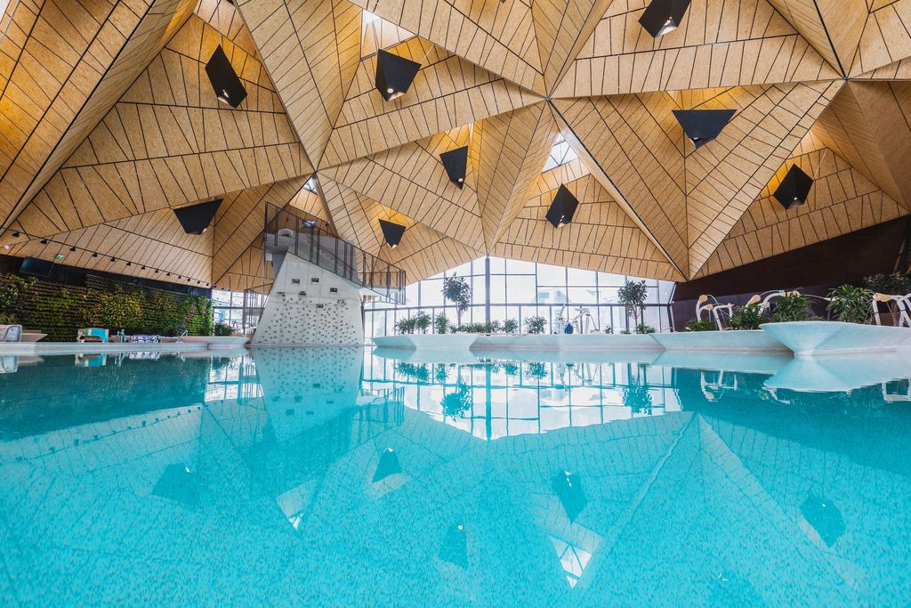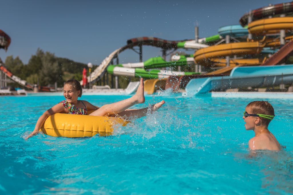Bazény ve Wellness Termalija: 2000 m² vodní plochy (velký proplouvací bazén 30-32 °C, masážní trysky, vodopád, rychlá řeka, bazén pod stanem 28-32 °C, masážní trysky, uzavřený tobogán se světelnými efekty, vodní Aqua bar, 2 dětské bazény 32-36 °C, 3 vířivky 34-36 °C. Součástí lázní Olimia je letní areál Thermal park Aqualuna (asi 1 km od hotelu) s vodní plochou 3000 m²: bazény s termální vodou, tobogány, nejrůznější skluzavky, bazén s umělým vlnobitím, Aquadžungle, Aquasafari, animační programy pro děti, vodní a taneční plochy nebo denní a noční bar. Otevřeno je dle počasí od 1. 5. do 30.9.