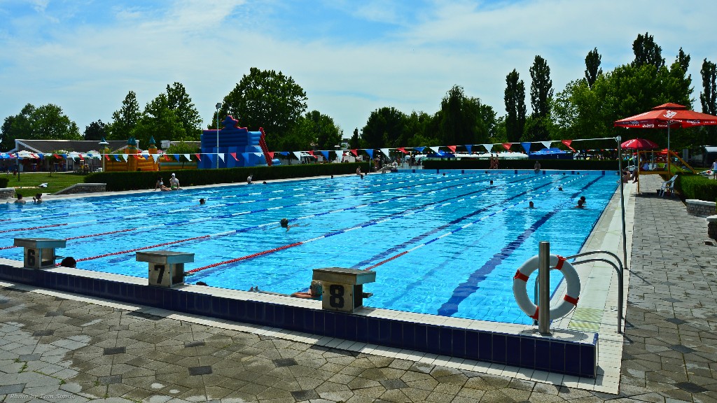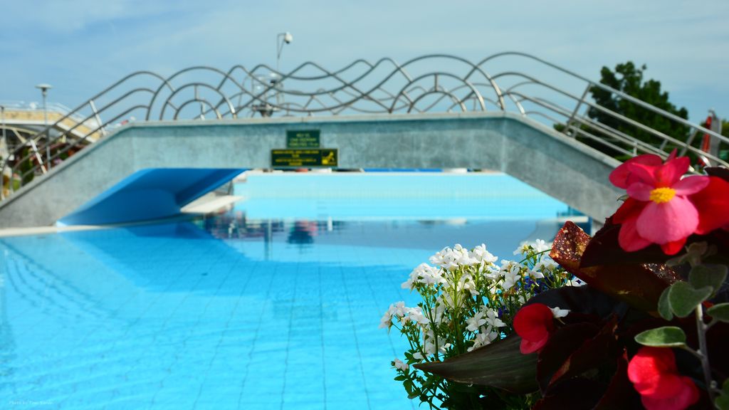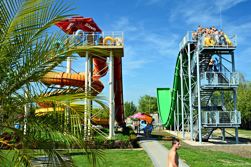 Venkovní část: hradní bazén (30 °C) s vodním hřibem a dětským bazénkem pro děti od 0 do 10 let, zážitkový bazén (27 °C) s divokou řekou, skluzavkou, vířivkou, hydromasážními tryskami a šíjovými sprchami, bazén s vlnobitím (26 °C), plavecký bazén 50 m (24 °C), bazén s tobogány (24 °C) se může používat s raftovou matrací, termální zážitkový bazén (34 °C): vířivá lehátka, vířivé lavice, šíjové sprchy.