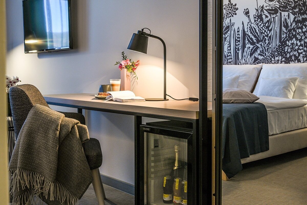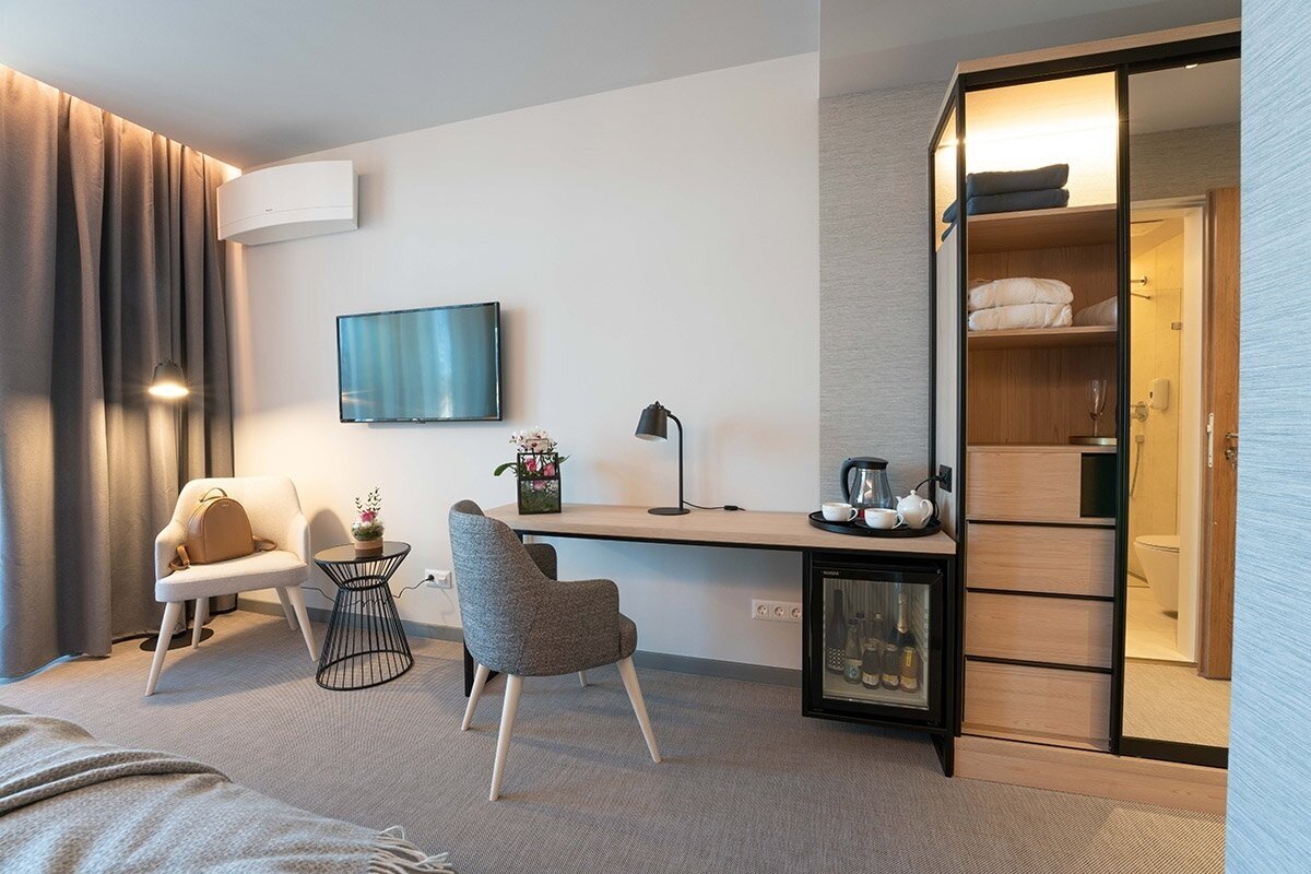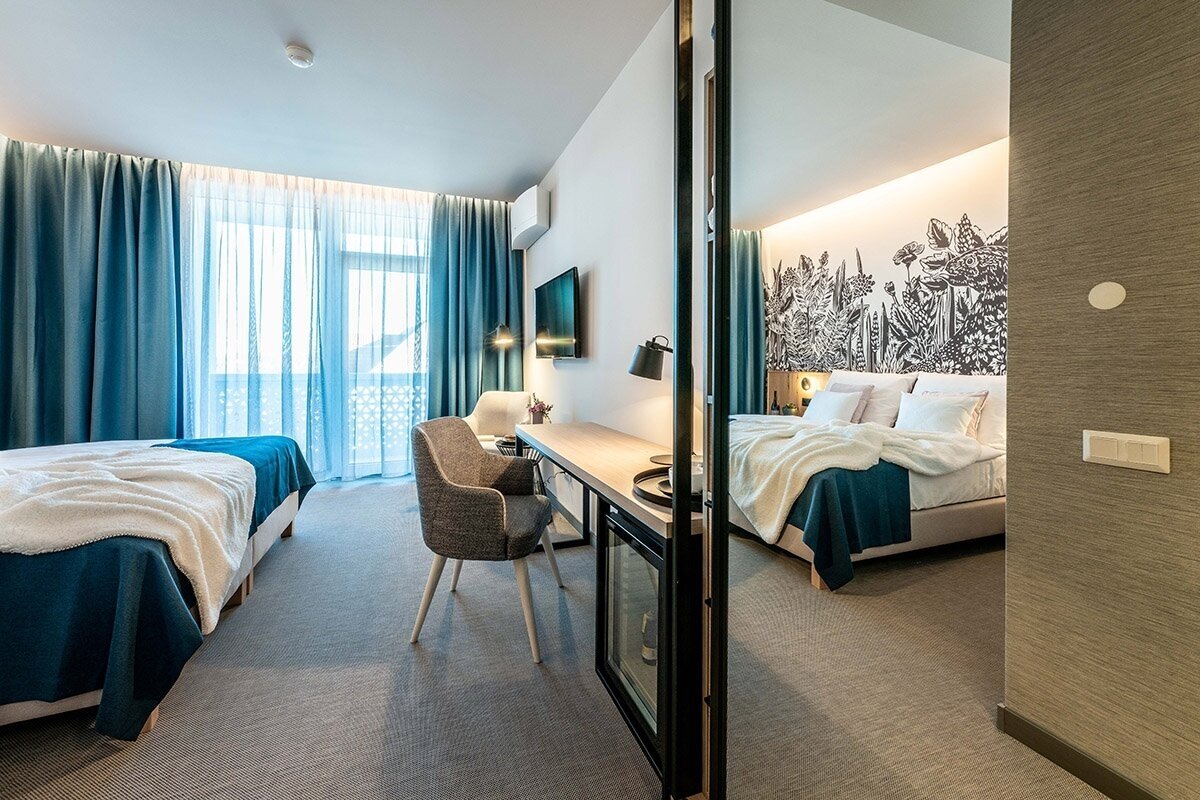 Pokoje DELUX (25 m²) s obývacím pokojem - klimatizace, koupelna se sprchou / vanou, fén, župan a osuška do wellness, LCD-TV, Wi-Fi, telefon, trezor, mini-bar, zařízení na přípravu čaje, velká terasa 25 m².