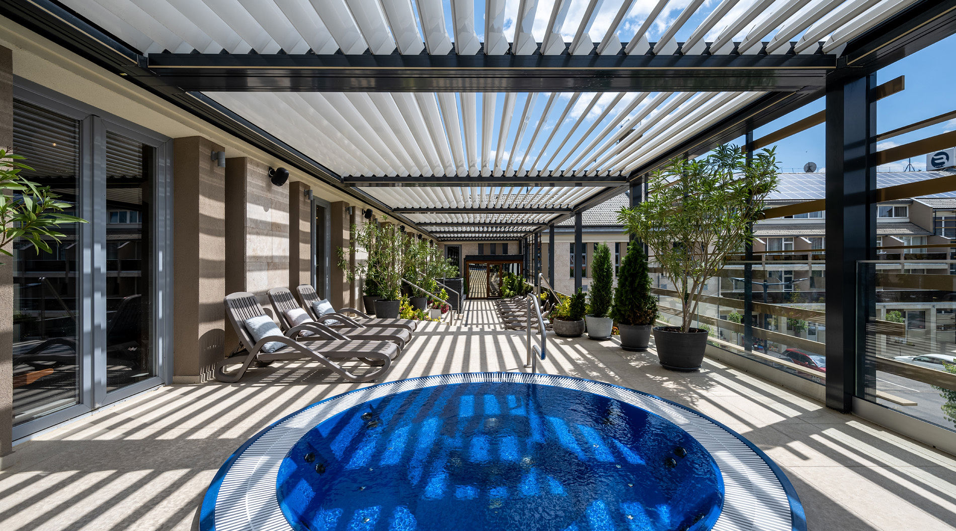 Panoramatická zážitková wellness terasa ELIX ve výšce 6 m od úrovně terénu nabízí venkovní jacuzzi (37 °C), panoramatickou finskou saunu, ponorný bazén se studenou vodou a relaxační lůžka. Fitness centrum je vybavené nejmodernějšími funkčními tréninkovými stroji Cybex a Precor. Možnost masáží a solárium za poplatek.