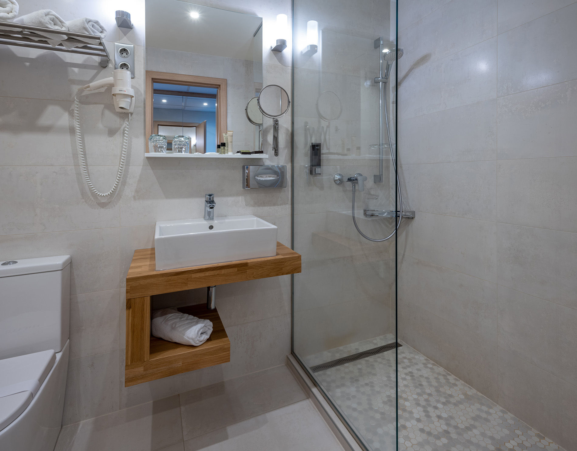 2 lůžk. pokoje PREMIUM ELEGANCE (29 m²) 1. patro – možnost přistýlky pro dítě, klimatizace, koupelna se sprchou, LED TV, telefon, Wi-Fi, trezor, mini-bar, výhled na Zemplínské hory nebo historickou hradní čtvrť a každý pokoj má balkon.